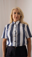 A Camisa Sopro ganha nova vida em uma estampa listrada azul e off white, que traz leveza visual e charme atemporal à peça. Com modelagem de manga curta, é feita em algodão egípcio e finalizada com botões de coco — um detalhe natural que reforça a essência sustentável da Evolve.